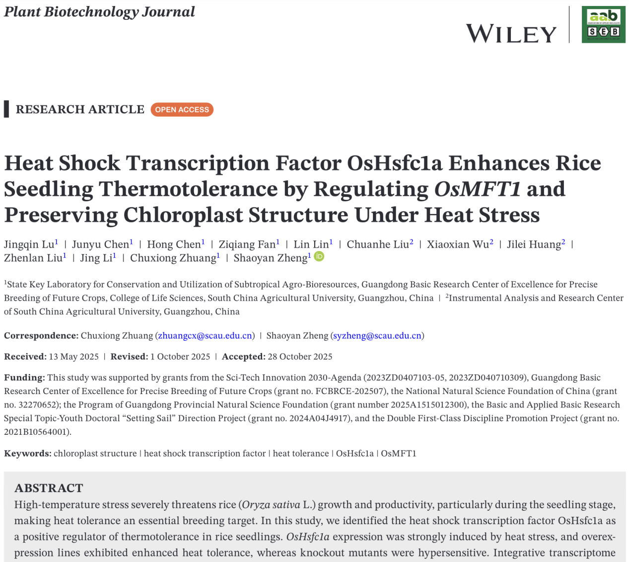2025年11月11日,《植物生物技术杂志(Plant Biotechnology Journal)》在线发表华南农业大学、广东省高等学校未来作物精准育种基础研究卓越中心研究成果。研究人员成功鉴定到一个关键的热激转录因子OsHsfc1a,深入解析了OsHsfc1a-OsMFT1模块调控叶绿体结构的分子机制,构建OsMFT1过表达和敲除水稻品种,发现OsMFT1过表达会加剧叶绿体损伤和细胞死亡,从而降低水稻的耐热性,而敲除OsMFT1能够显著提高水稻的耐热能力,进而发现了维持叶绿体结构完整性、增强水稻幼苗耐热性的全新分子通路。这一发现深化了目前对植物应对高温胁迫的理解,为培育高产、稳产、耐热的水稻新品种提供了基因资源和理论依据。